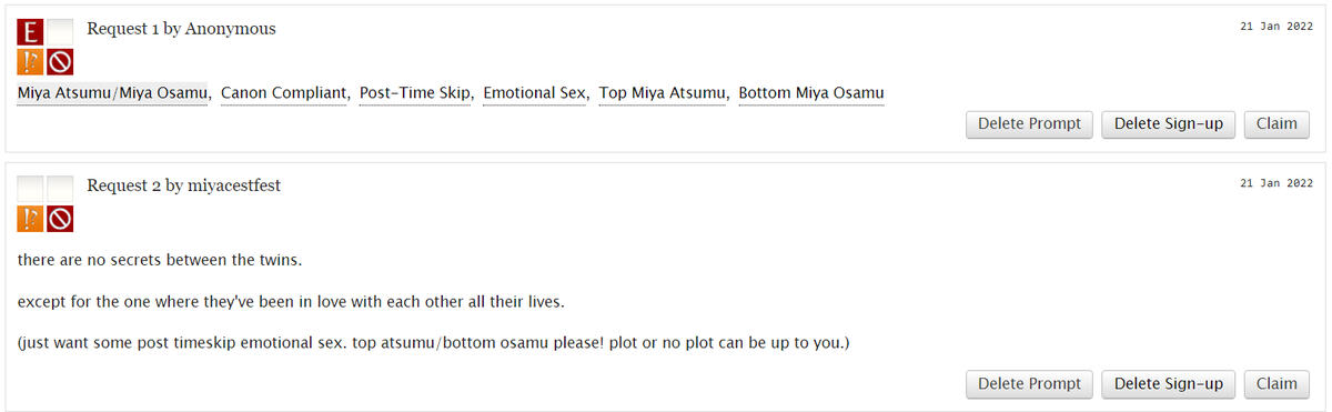 Prompt submissions will remain open throughout the entire duration of the event.To submit a prompt, please head to the Prompt Form.A variety of fields are available for you to fill out (Relationships, Additional Tags, Categories, Rating, Archive Warnings, Description) however none of these are required. Just fill in whatever is applicable to your prompt.Anything is allowed for this fest, feel free to also list anything you would like the creator to exclude or include (e.g. no major character death, happy ending please, top [Atsumu/Osamu] only).By default, prompts have been set to be anonymous. If you would like to reveal yourself in your prompt, untick the 'Semi-anonymous Prompt?' box.If you need to edit your prompts after submitting them, you can do so under 'My Prompts' and then 'Edit Sign-up'.Examples of prompts have been provided below.